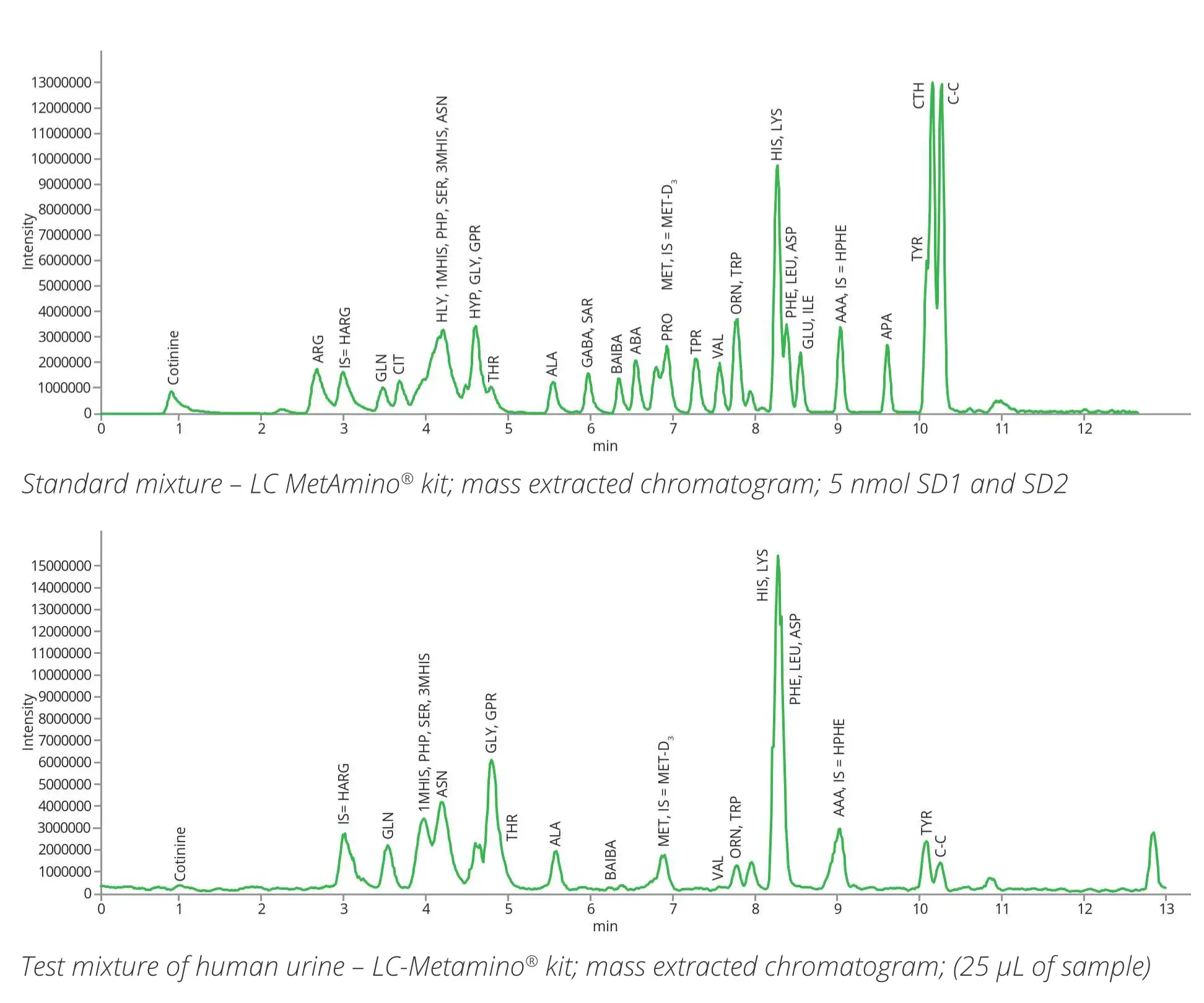 Untersuchung einer menschlichen Urinprobe nach der Probenaufbereitung unter der Verwendung des MetAmino®-Kits. Mit den mitgelieferten Standards können die gefundenen Aminosäuren quantitativ bestimmt werden.
